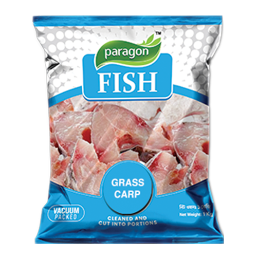 শ্রীমঙ্গলের প্যারাগন হ্যাচারী থেকে সংগ্রহ করা ২ কেজি+ সাইজের তাজা গ্রাস কার্প মাছ, ১ কেজি ভ্যাকুয়াম প্যাকড প্যাকেটে।